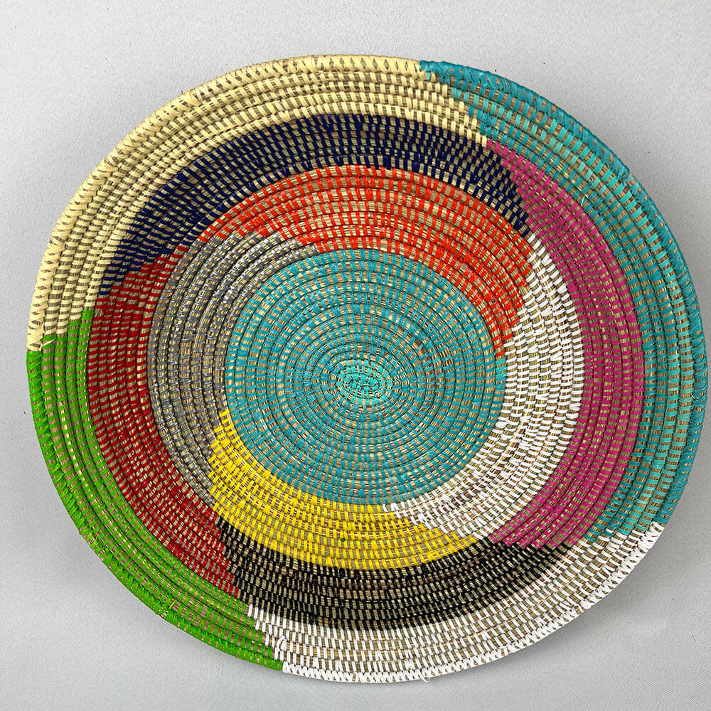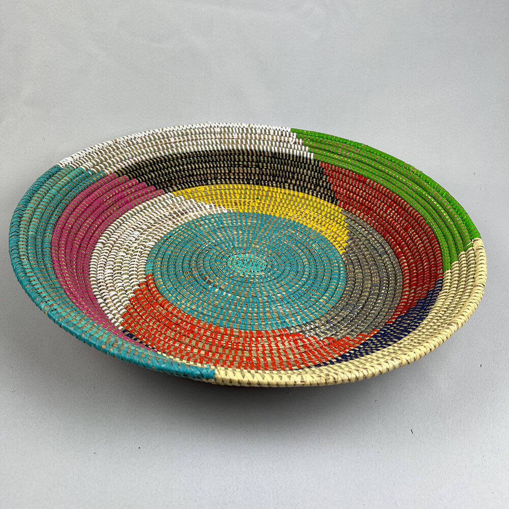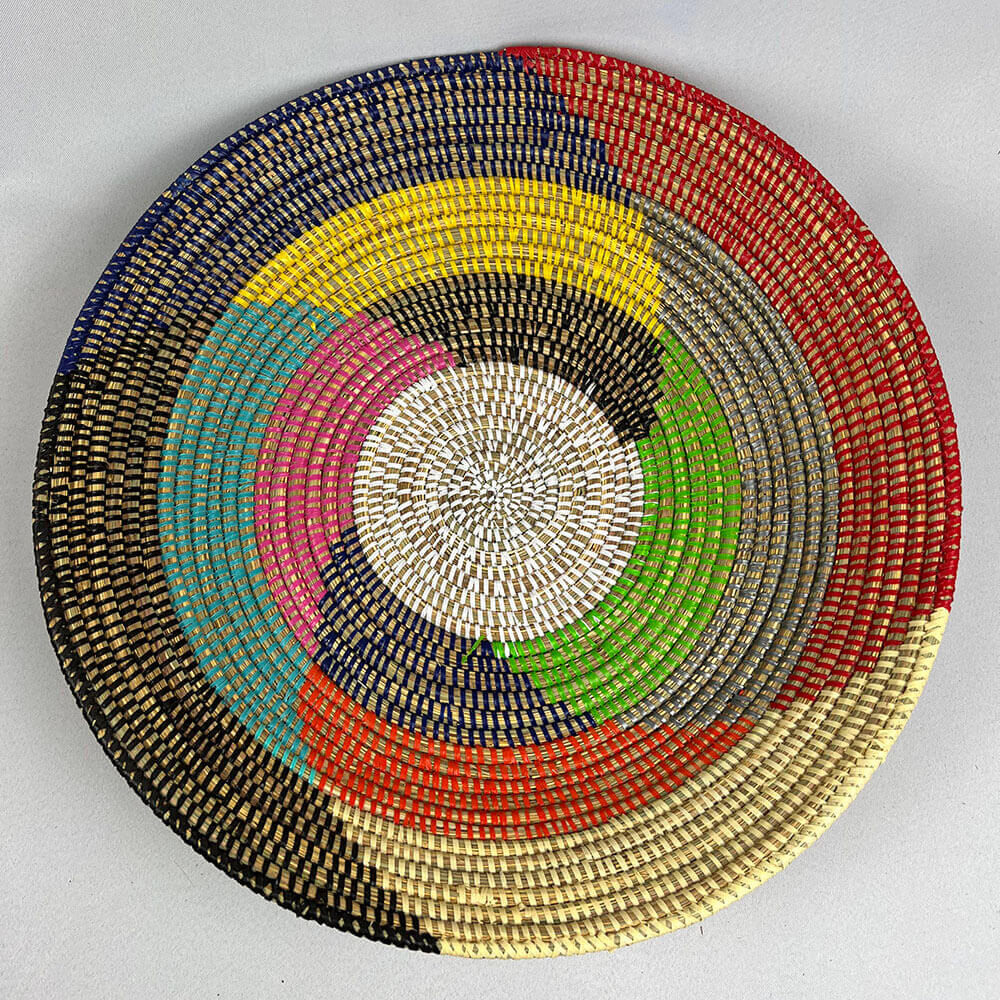 "Ein perfekter Obst-, Brot- und Gemüsekorb sowie ein wunderschöner Wandkorb. Es wird aus einem lokalen Süßgras namens NDIOROKH und Streifen aus recyceltem Kunststoff hergestellt.