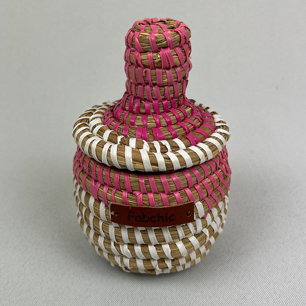 "Dieser wunderschöne Topf wurde von Frauen in einem abgelegenen Dorf im Senegal handgefertigt und eignet sich perfekt für Schmuck, Süßigkeiten, Kochutensilien oder viele andere Haushaltsgegenstände sowie als schöner Blumentopf. Er besteht aus lokalem Gras namens NDIOROKH und Streifen aus recyceltem Kunststoff.