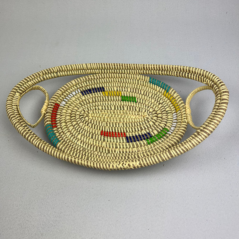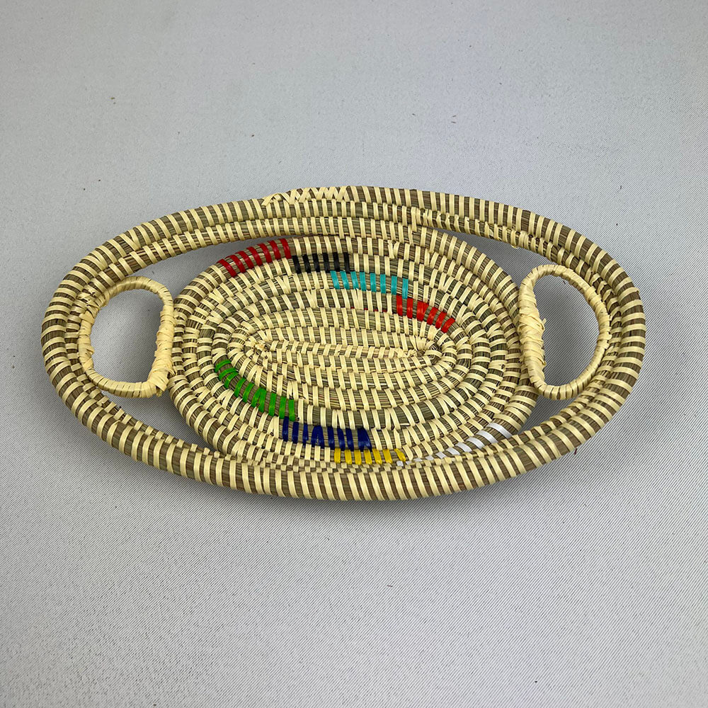 "Ein perfekter Obst-, Brot- und Gemüsekorb sowie ein wunderschöner Wandkorb. Es wird aus einem lokalen Süßgras namens NDIOROKH und Streifen aus recyceltem Kunststoff hergestellt.