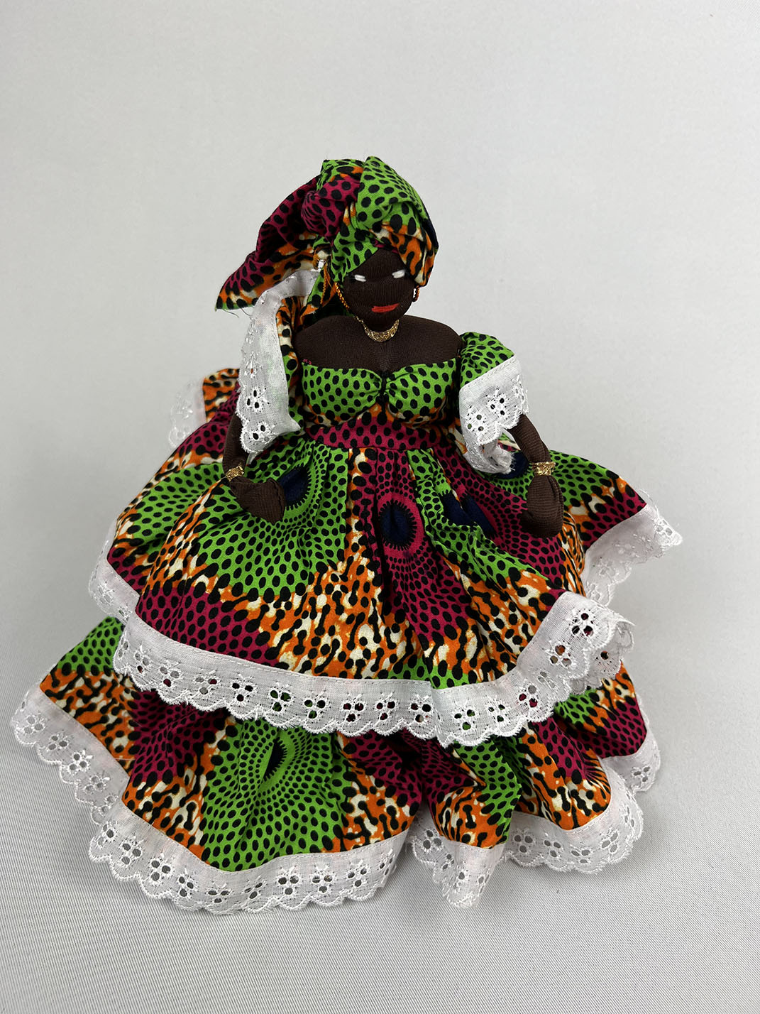 "Handgefertigte Puppe, gekleidet in ein traditionelles Kleid aus Zentralafrika. Diese Puppe ist sorgfältig genäht. Es wird von Kunsthandwerkerinnen im Rahmen eines Frauenförderungsprogramms in Kenia hergestellt.