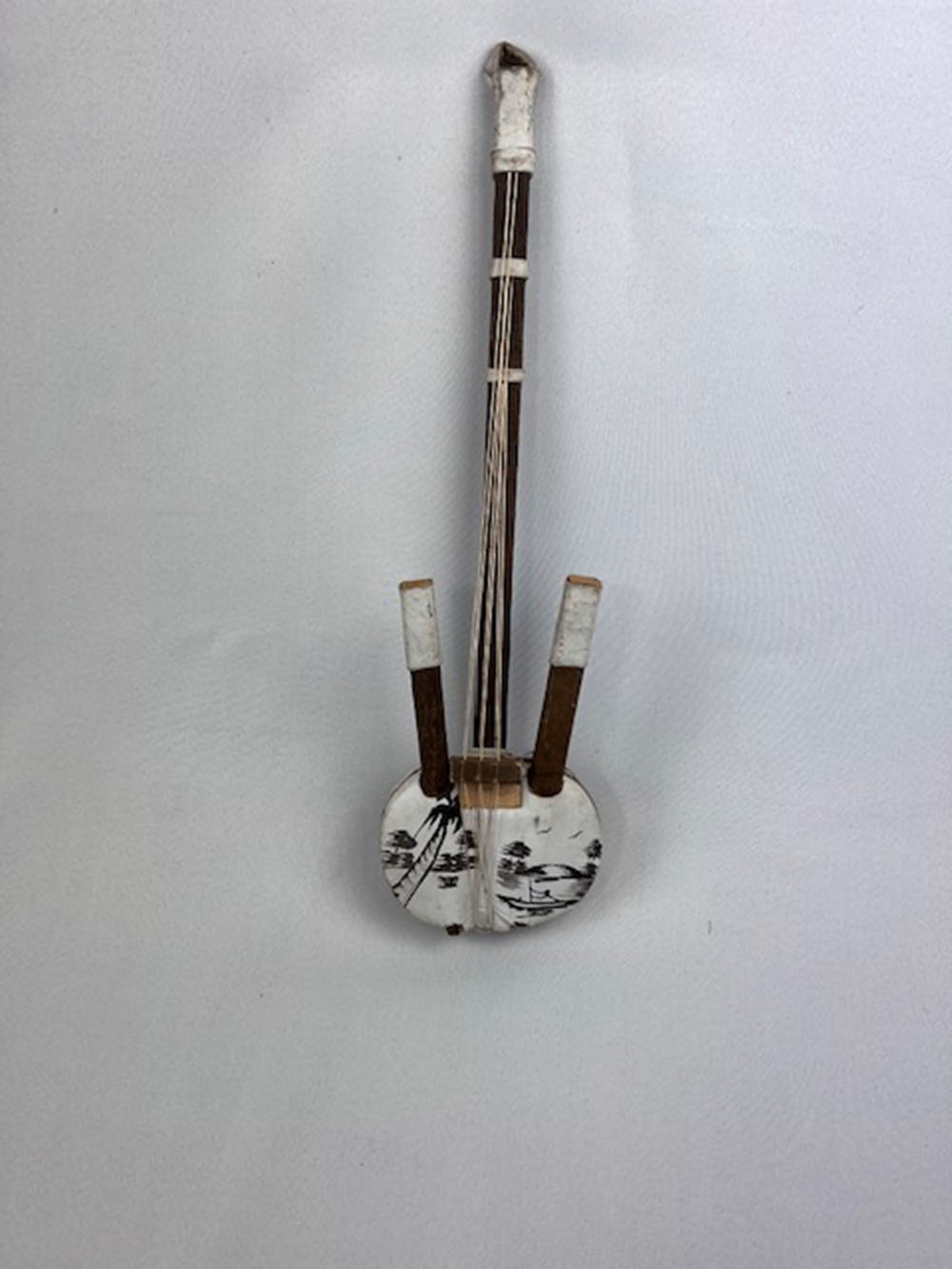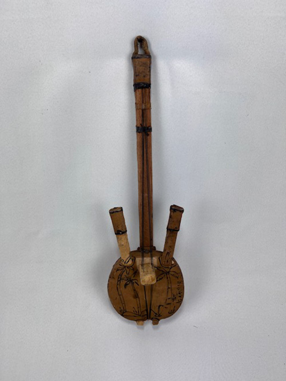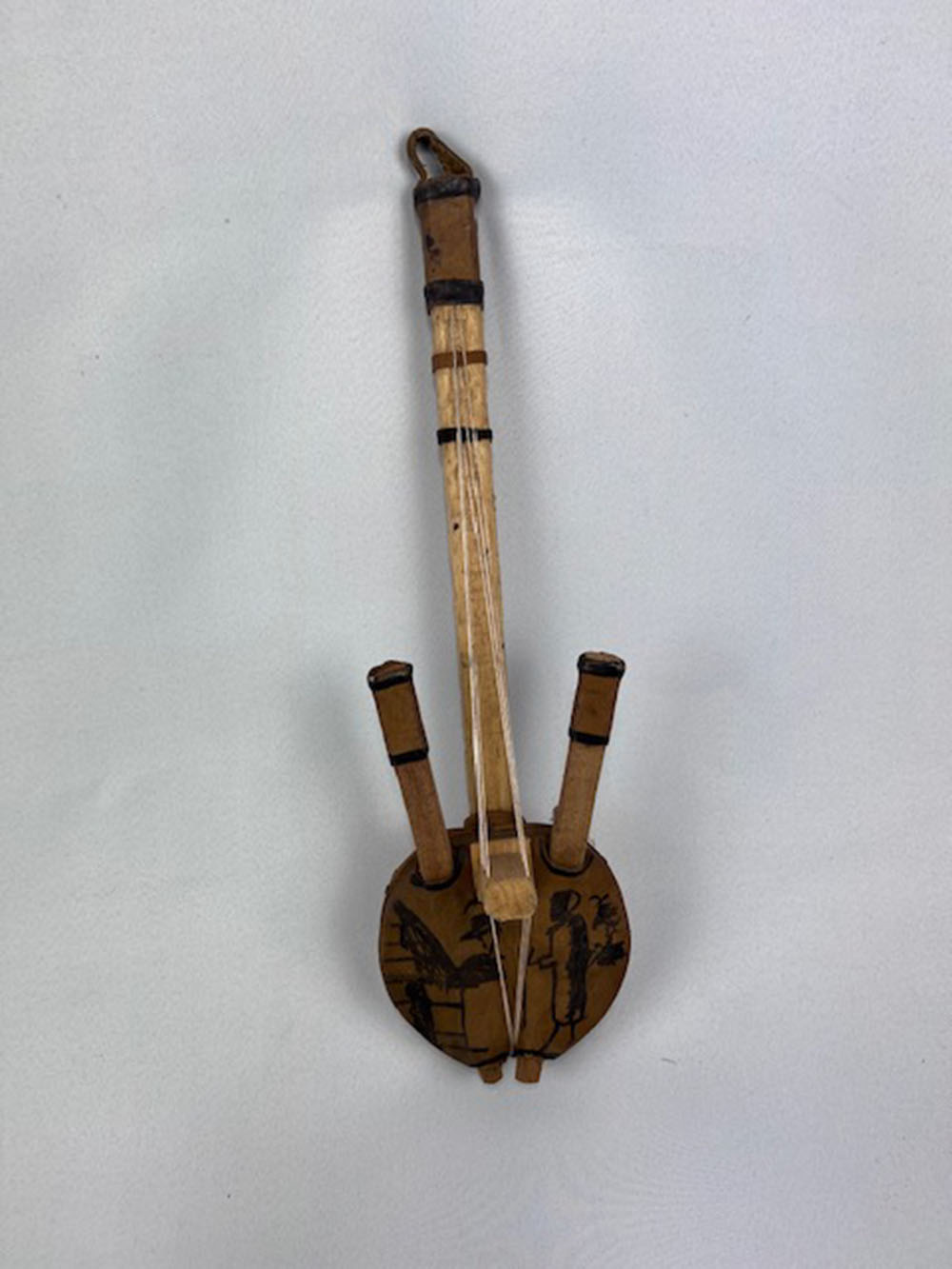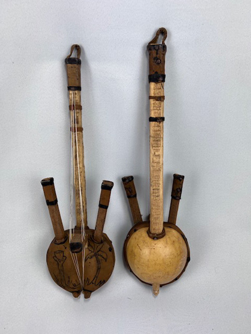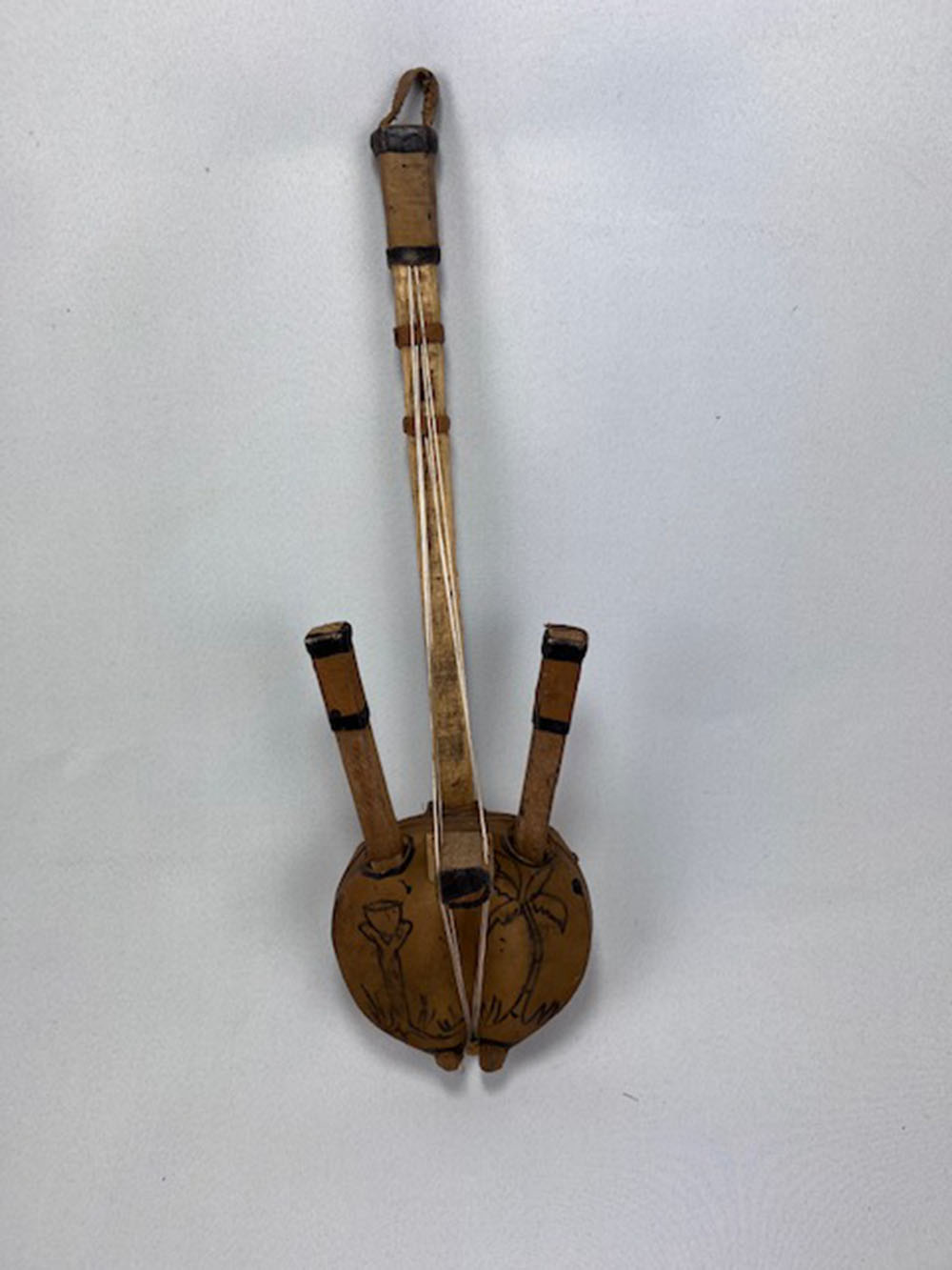 • Hals und Steg: Die Kora hat einen langen Hals aus Hartholz, der durch den Kalebassenkörper verläuft. Ein gekerbter Steg stützt die Saiten und überträgt ihre Vibrationen auf den Resonanzkörper.