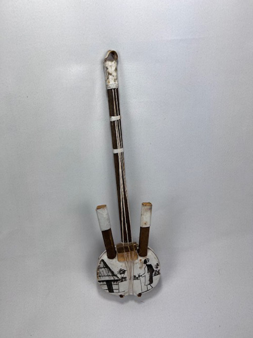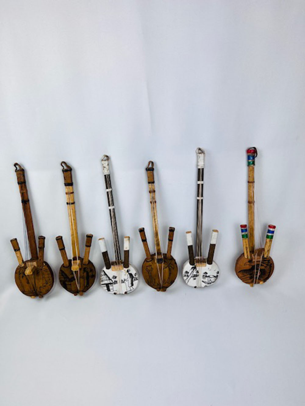 • Saiten: Die Kora hat typischerweise 21 Saiten, die in zwei parallelen Reihen von 10 und 11 Saiten angeordnet sind. Die Saiten bestehen aus Angelschnur oder traditionell aus Antilopenhaut.