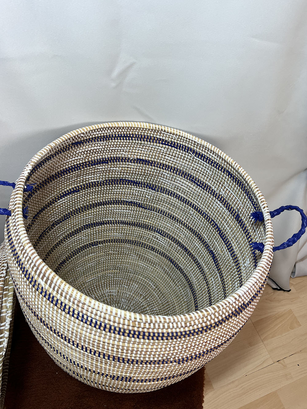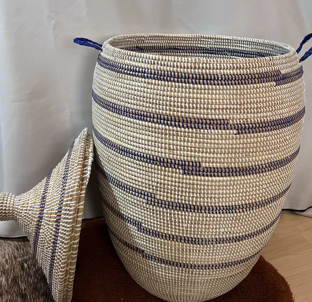 "Handgewebt von Frauen in einem abgelegenen Dorf in der Region Thies im Senegal. Masse: Höhe mit Deckel 80 cm, ohne Deckel 62 cm, Durchmesser 152 cm. Genaue Farbe und Muster können vom Bild abweichen, da es sich um einen EINZIGARTIGEN Korb handelt.
