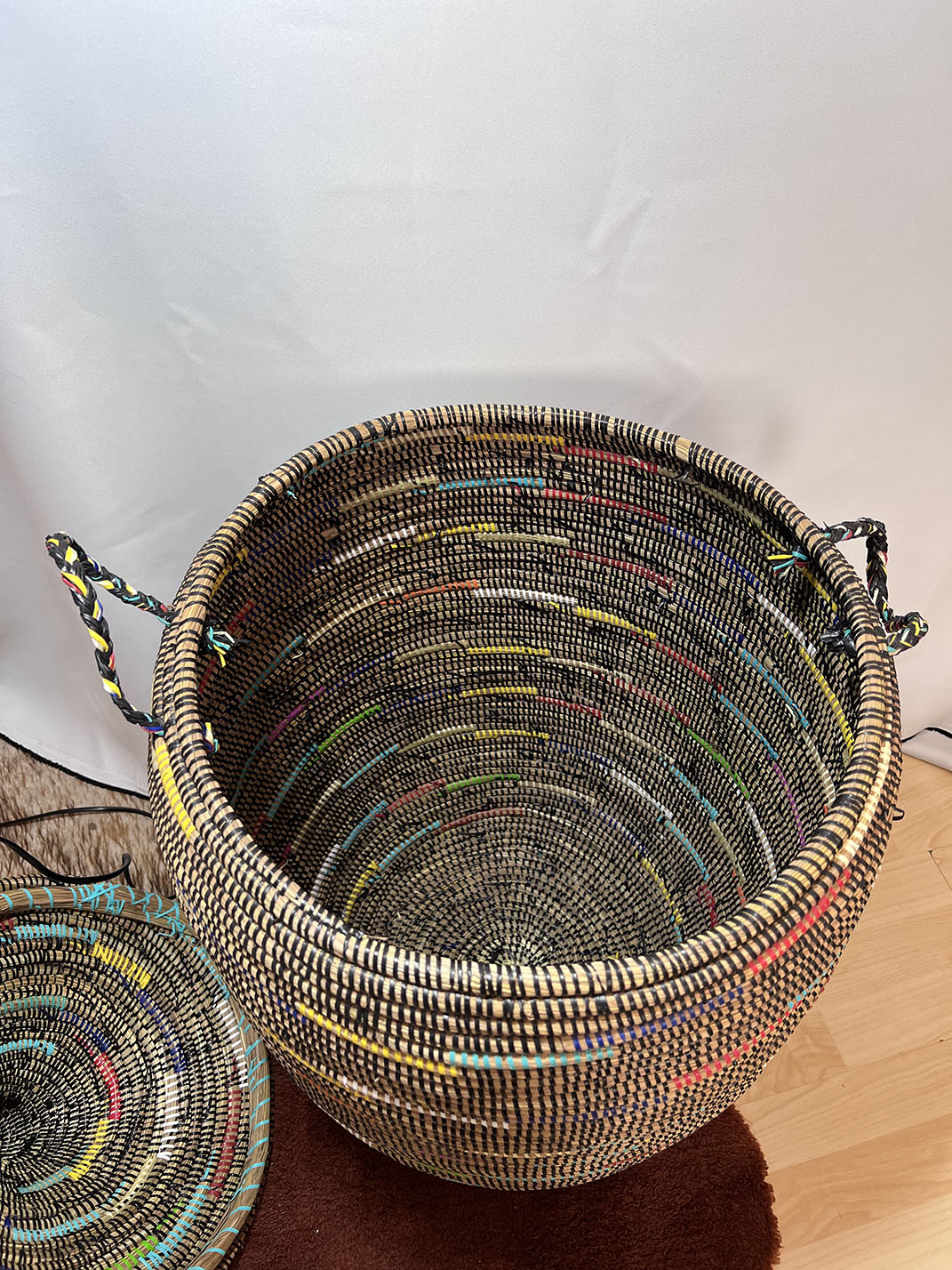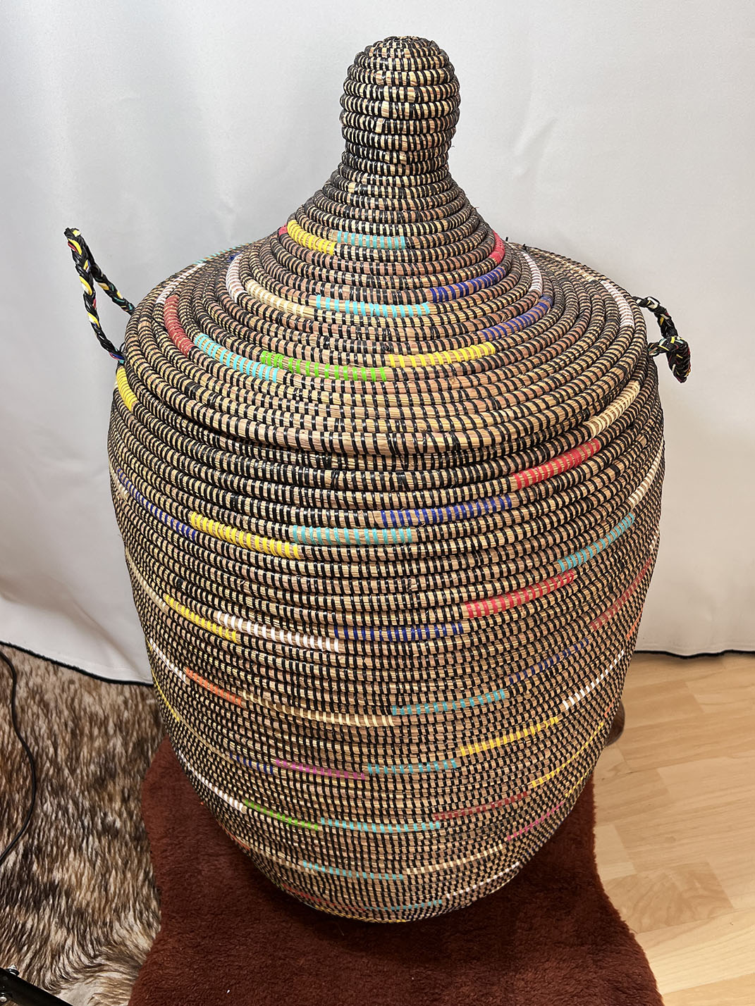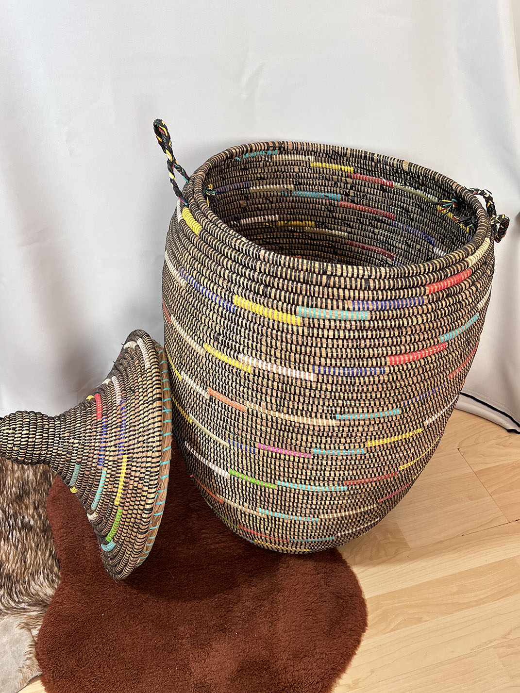"Handgewebt von Frauen in einem abgelegenen Dorf in der Region Thies im Senegal. Muster können vom Bild abweichen, da es sich um einen EINZIGARTIGEN Korb handelt.