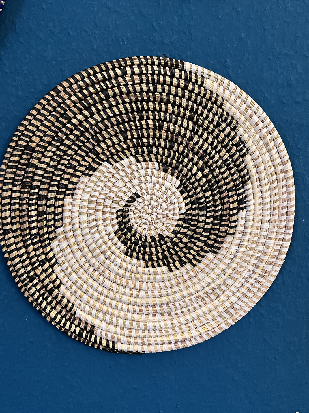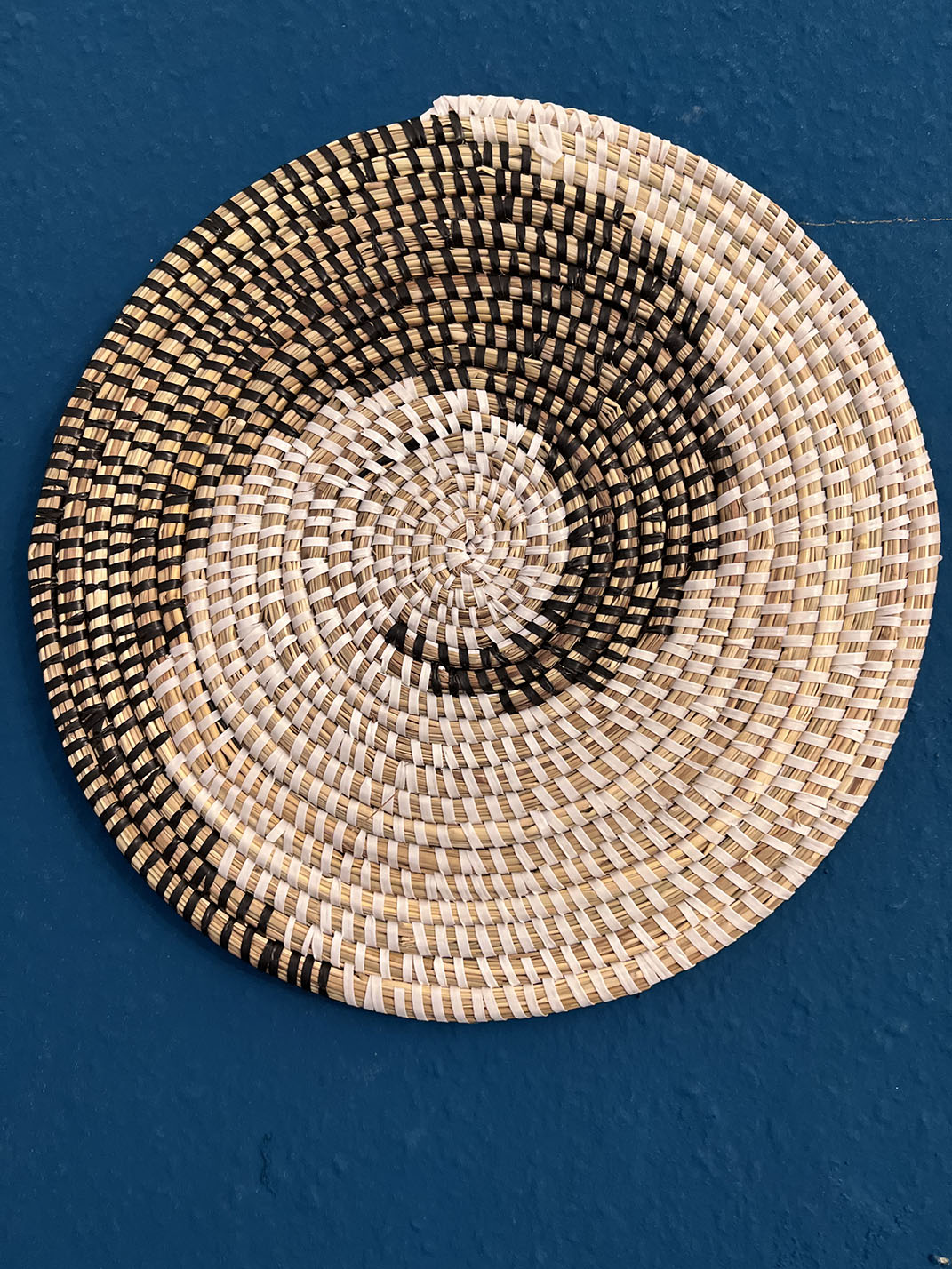 "Ein perfekter Obst-, Brot- und Gemüsekorb sowie ein wunderschöner Wandkorb. Es wird aus einem lokalen Süßgras namens NDIOROKH und Streifen aus recyceltem Kunststoff hergestellt.